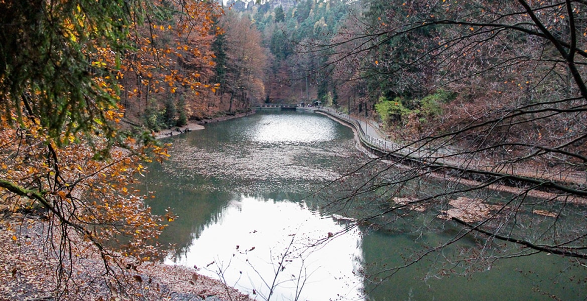 Ursprünglich sollte der Stausee einmal zum Hochwasserschutz, zu Feuerlöschzwecken und zur Fischzucht dienen. Heute tummeln sich hier die Besucher der Sächsischen Schweiz. Dabei bietet sich hinter den Bäumen eine sagenhafte Felskulisse: So sieht man zum Beispiel die „Lokomotive“, das „Lamm“ und den „Talwächter“. Wer möchte, kann den malerischen See auch in ca. 30 min umrunden. Hier führt euch ein schmaler Wanderweg um den See herum. Bleibt jedoch lieber auf der asphaltierten Seite, falls ihr mit dem Kinderwagen unterwegs seid.