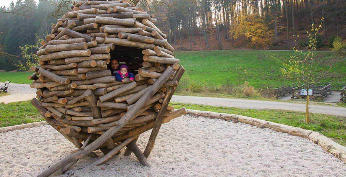 Wenn ihr unterhalb der Waldhusche seid, seht ihr ein großes Holz-Ei. Hier können die Kinder hinein klettern und sich vorstellen, wie sich wohl ein Eichhörnchen in seinem Bau fühlen muss. Gleich daneben steht ein Haus und dahinter eine Blockscheune, wo es wieder allerhand zu