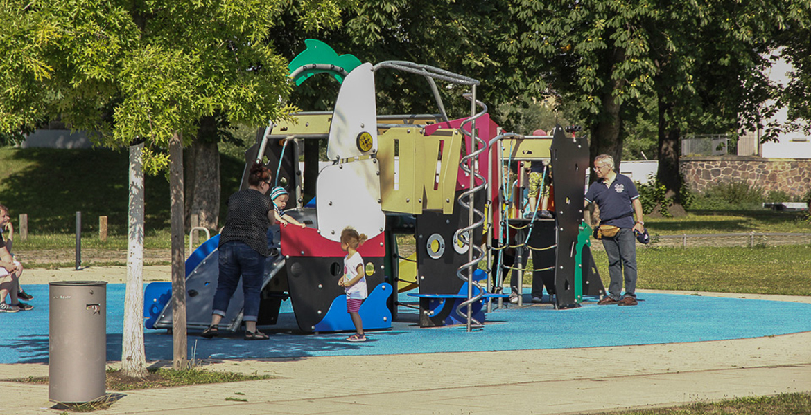 Der Untergrund von den Spielplätzen ist aus Kunststoff und sehr weich. Auf einem der Beiden Spielplätze befinden sich überwiegend Klettergerüste und Stangen (ist eher was für die größeren ab 4). Auf dem anderen Spielplatz gibt es auch viel zu klettern. Hier besteht der Spielplatz aus Holz/Kunststoff, Seilen und Stangen. Es gibt zwei Rutschen eine Stange zum runterrutschen und wieder viel zum Klettern.