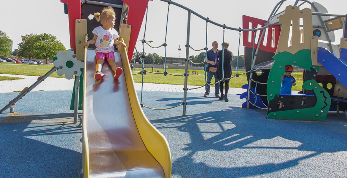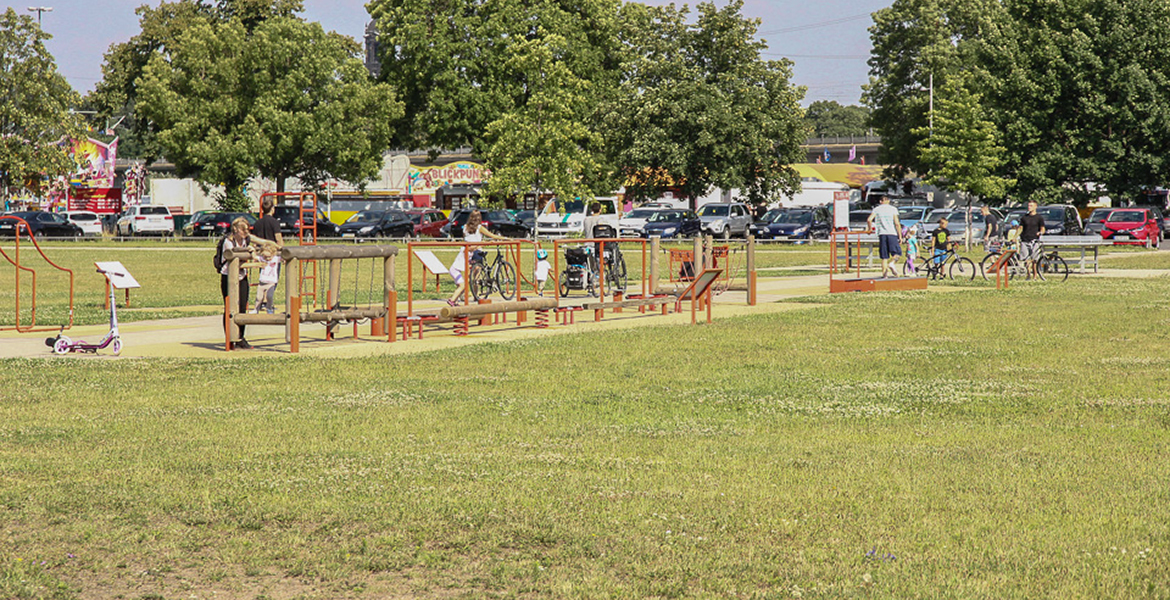 Gleich daneben ist noch ein Basketballfeld und ein Tennisfeld. Umgeben sind die Spielfelder von großen Wiesen und wegen. Ein Sport Parkour ist auch noch auf dem Gelände. Dieser wird überwiegend von Sportlern genutzt aber auch Ihr könnt Euch mal dran versuchen. Verbinden kann man die Tour mit dem Besuch auf dem Rummel. Denn wenn dieser in der Stadt ist dann ist der genau gegenüber.