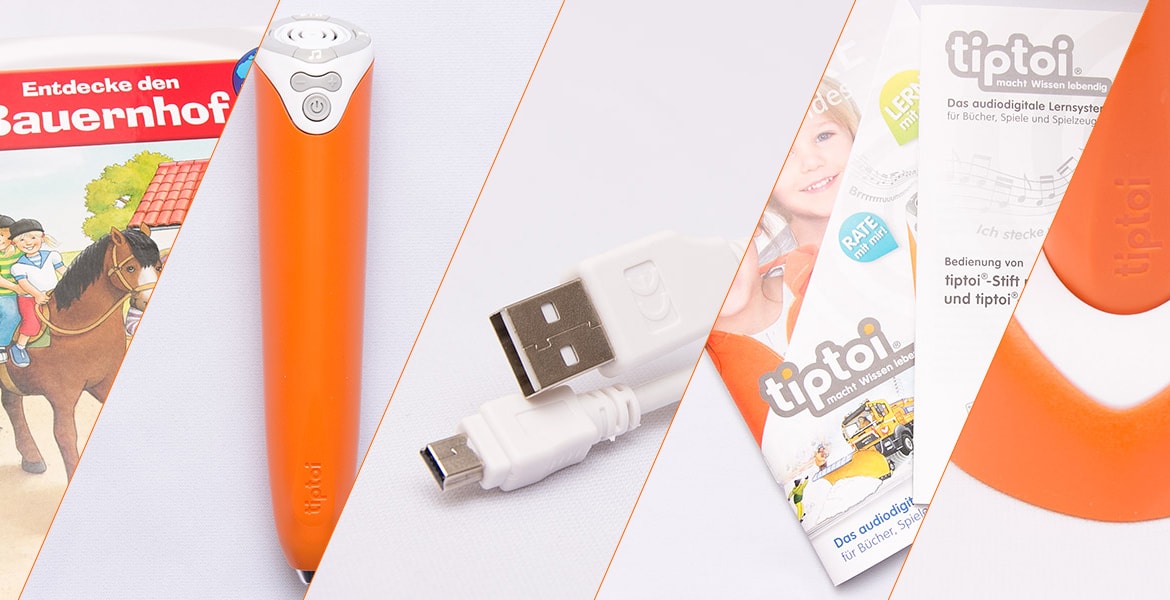 In dem Starterset des Tiptio steckt der Stift sowie ein Buch je nach Starterset. Zusätzlich befindet sich noch in dem Tiptoi Starterset ein USB-Kabel zum Übertragen der verschiedenen Bücher und Laden des Tiptoi. Leider befindet sich nicht in jedem Tiptoi Starterset die zwei Akkus oder Bakterien vom Typ AAA/LR03. Diese müsst ihr separat kaufen. Um den Stift hinzustellen liegt dem Starterset noch ein Stifthalter bei.